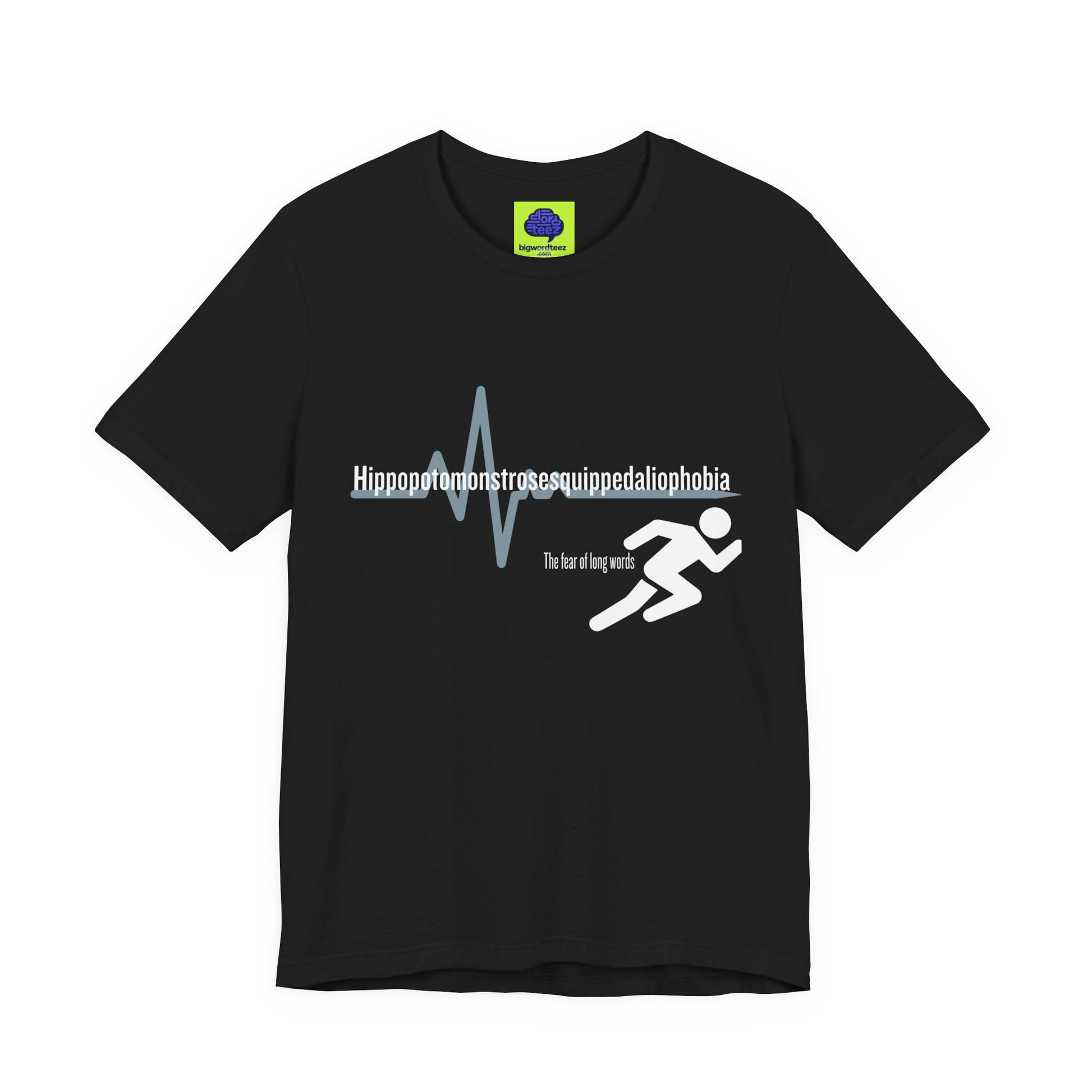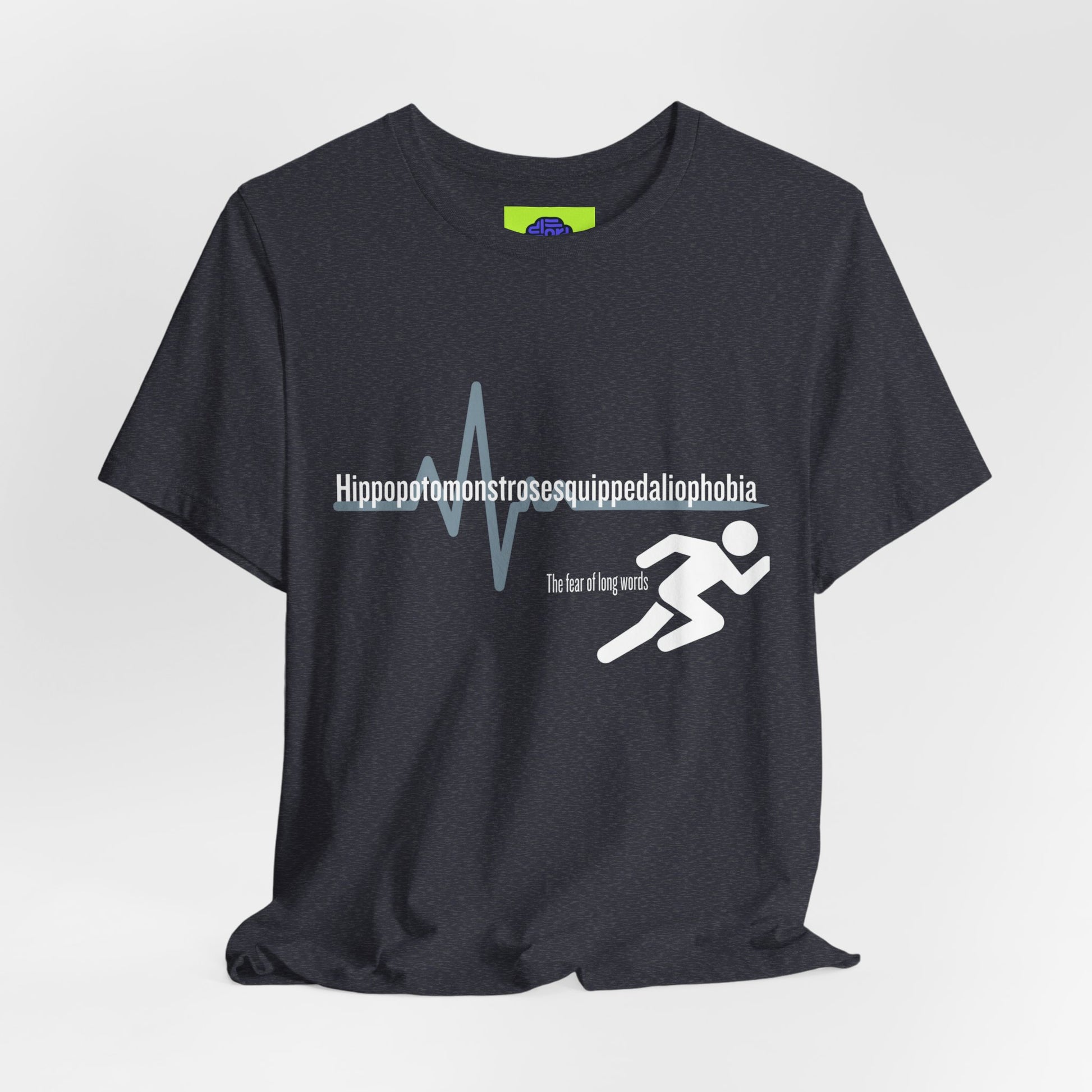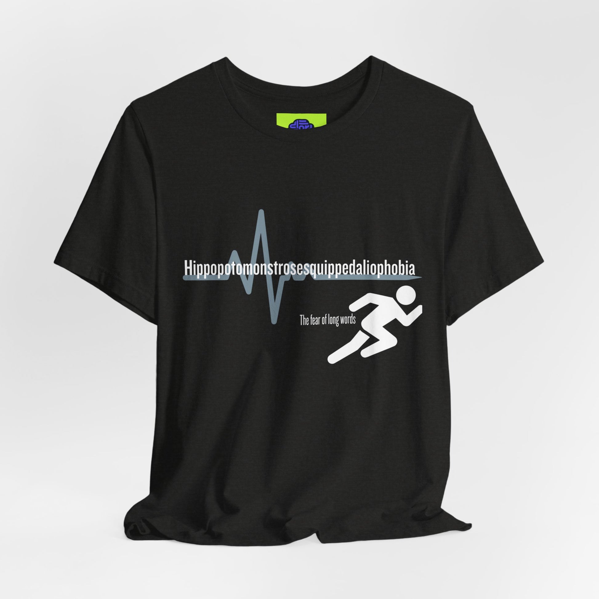 For the person who isn’t afraid of a challenge—just long words. This shirt features the world's most ironic word: the medical term for the fear of long words. Featuring a sleek "heartbeat" graphic that mimics the panic of a 15-syllable word.